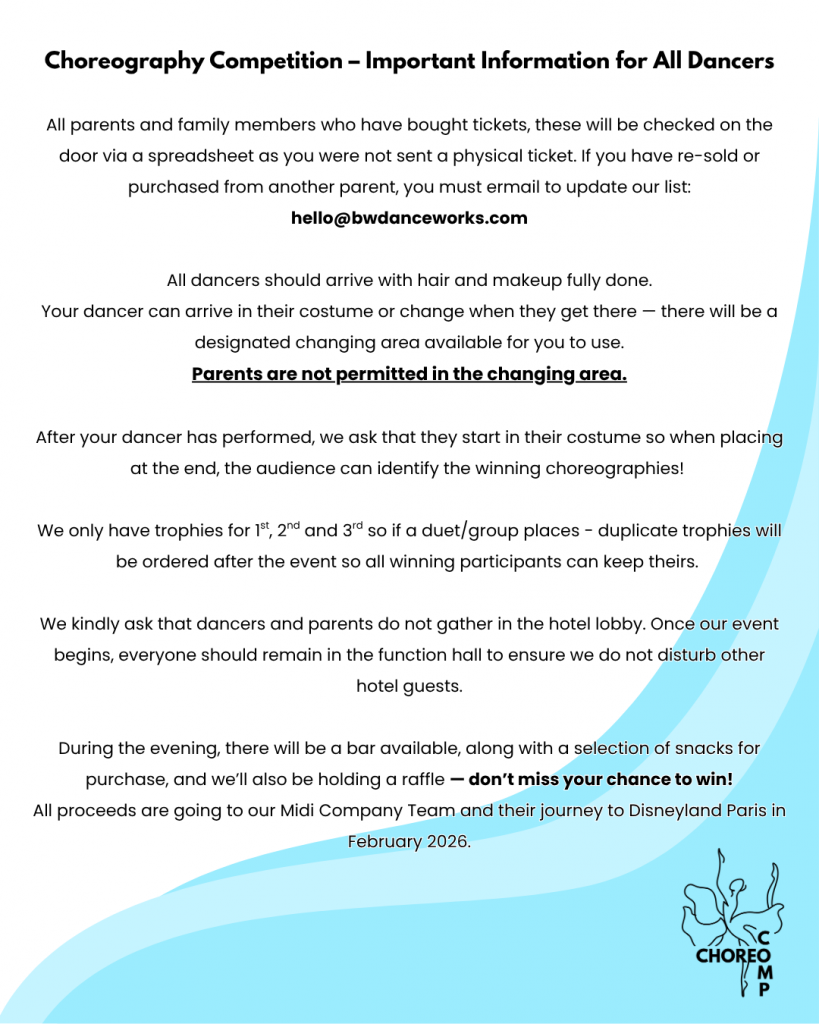 Our choreography competition will be held on Saturday 15th of November 2025. Friends and Family can arrive from 6.30pm and the Competition will begin promtly at 7pm. The results and trophies will be announced at 10pm. The event will finish at 11pm. There will be a bar open for parents and a small selection of snacks. In between our age sections we will have a couple of games PLUS performances from our Company Teams.