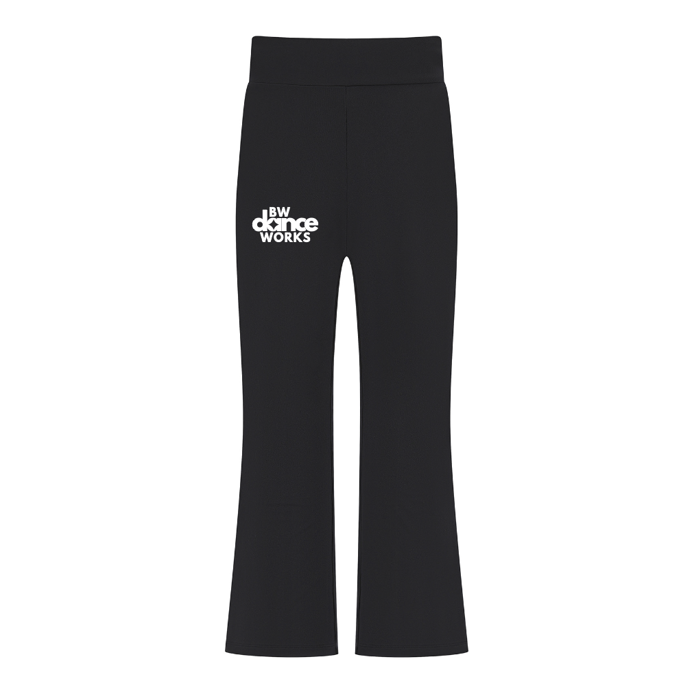 Arrive to class in comfort with these soft and breathable kids flared leggings. With the BW Dance Works logo on the front thigh, it is perfect for getting to and from class, rehearsals, shows or competitions.